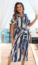Платье А-силуэта выполнено из тонкого джинса. V-образный вырез горловины, застежка по планкам на 4 пуговицы и петли. По переду застрочены защипы, имеются нагрудные вытачки и накладные карманы. Рукав цельнокроеный с отложной манжетой. Спинка со средним швом и талевыми вытачками. По спинке настрочена декоративная деталь с терм аппликацией. По бокам имеется разрезы и карманы, низ закругленный. Имеется съемный пояс
