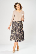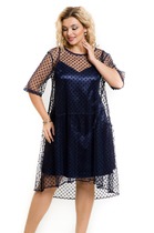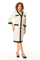 Платье прямого силуэта выполнено из атласа. Округлый вырез горловины. С левой стороны имеется разрез. Рукав цельнокроеный с отложной манжетой. Спинка со средним швом. Имеется съемный пояс. Длина по спинке-120 см, длина рукава –22 см.