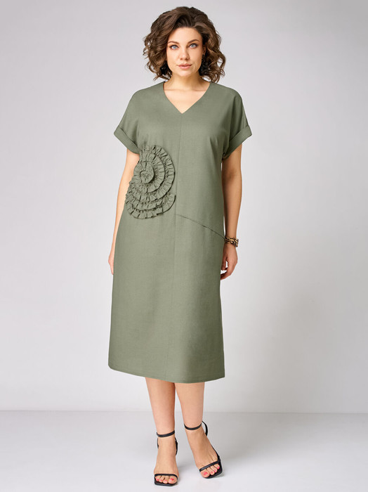 Платье женское прямого силуэта выполнено из льняной ткани. V-образный вырез горловины. Перед со средним швом, с нагрудными вытачками из бокового шва. По правой стороне настрочен декоративный элемент в виде цветка. Спинка со средним швом. Рукав цельнокроеный с отложной манжетой. Длина изделия по спинке-111см, длина рукава от горловины-29см.