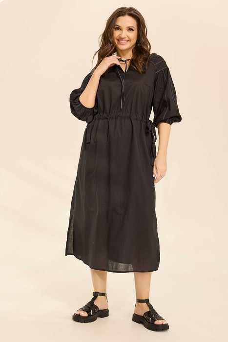 Платье А-силуэта с кулисой по линии талии. В куличу втянута лента, завязывающимися по бокам. В боковых швах - разрезы. Рукав реглан, отрезной в области плеча, с настроченной отделочной тесьмой. По верху нижней части рукава - сборка. Рукав внизу на резинке. Настроченна тесьма. Горловина круглая, с вырезом "капелька" на заявязке изотделочной тесьмы. Платье на подкладке от линии талии.