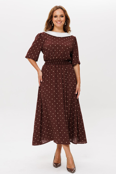 Платье полу прилегающего силуэта , расклешенное к низу, отрезное по линии талии со вставленным поясом на "венгерке". Рукав одношовный, втачной. Воротник плосколежащий, переходящий на спинке в рельефы, заканчивается бантом. Застежка на тесьму-молнию в среднем шве спинки до воротника.