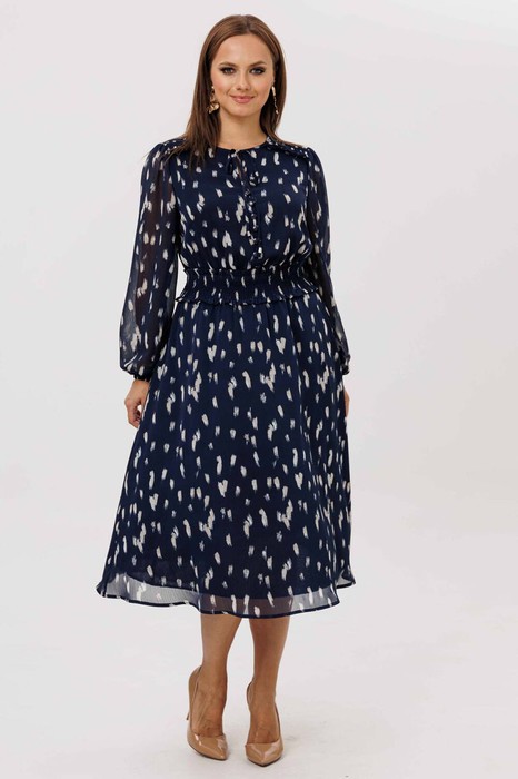 Платье женское свободного силуэта, отрезное по линии талии, расклешённое к низу, выполнено из ткани шифон. По линии талии сборка на резинку «венгерку». Горловина v-образная с небольшими рюшей по переду до линии талии на завязках. Передняя полочка дополнительно украшена рюшами. Рукава одно шовные втачные, по низу легкая сборка. Платье на тонкой трикотажной подкладке с декоративной пришивной тесьмой..