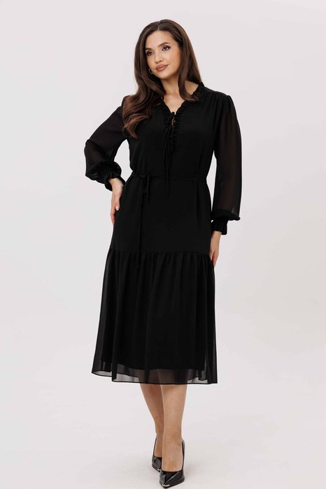 Платье свободного силуэта с подрезом ниже линии бедер. Перед с кокеткой. Горловина обработана рюшей и завязками. Рукав одношовный, заканчивающийся манжетой на венгерке. По окату рукава сборка. Платье на подкладке. Дополняет модель пояс.