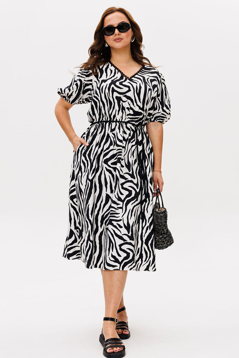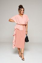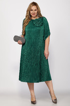 Платье женское полуприлегающего силуэта отрезное по линии талии. Лиф переда с нагрудными вытачками. Горловина V-образная. По среднему шву спинки сверху застёжка потайная молния. Юбка расклешённая. По линии талии эластичная тесьма резинка. Рукава одно шовные втачные. По окату рукава небольшие складки, низ со сборками. Украшает платье кружево. Изделие дополняет пояс кушак. Платье без подкладки.