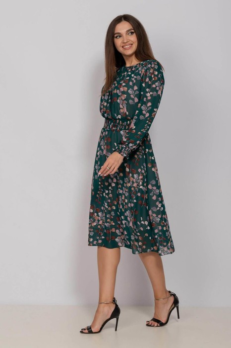 Платье женское свободного силуэта, отрезное по линии талии, расклешённое к низу, выполнено из ткани шифон. По линии талии сборка на резинку «венгерку». Горловина круглая со сборкой по переду и на завязке по спинке.  Рукава одношовные втачные, по низу сборка на резинку «венгерку».   Платье на тонкой трикотажной подкладке.