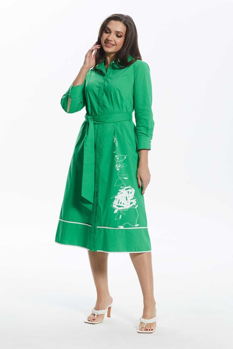 Женское платье – рубашка свободного силуэта выполнено из хлопко содержащей ткани. По переду нагрудные вытачки, потайная застёжка на прорезные петли и пуговицы, декоративная печать. По спинке кокетка и две небольшие складки. Воротник отложной на стойке. Рукава одношовные втачные на манжете. Горизонтальный подрез по низу платья и низ платья обработан контрастным кантом. В боковых швах функциональные карманы. Платье без подкладки. Дополнением служит пояс.