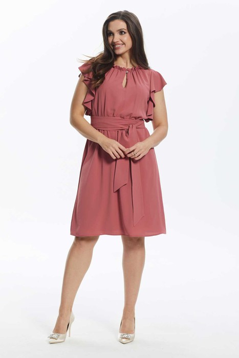 Платье женское полуприлегающего силуэта, отрезное по линии талии, на резинке, без рукавов, выполнено из тонкой плательной ткани. Юбка, слегка расклешённая к низу. По переду застёжка на воздушную петлю и пуговицу. Горловина круглая с небольших рюшей.  Широкие воланы от плеча до талии. Платье дополняет пояс. Платье на тонкой трикотажной подкладке.
