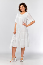 Платье женское свободного силуэта, отрезное по линии талии, расклешённое к низу, выполнено из ткани шифон. По линии талии сборка на резинку «венгерку». Горловина v-образная с небольших рюшей по переду до линии талии на завязках.  Рукава одно шовные втачные, по низу сборка на резинку «венгерку».   Платье на тонкой трикотажной подкладке.