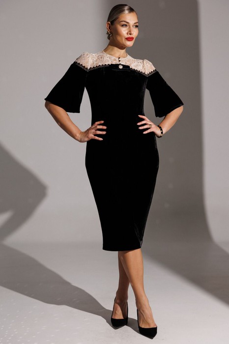 В ожидании  череды новогодних и рождественских мероприятий мы уже сейчас задумываемся о нарядах для каждой из Вас. Обратите внимание на это бархатное платье с ажурным гипюром от бренда "МОДА-ЮРС" - оно выглядит роскошно. Платье полуприлегающего силуэта с рельефами по переду и талиевыми вытачками по спинке. Спинка со средним швом, который переходит в шлицу. Платье по переду и спинке с кокетками, которые декорированы тесьмой. Рукав расширенный, по окату со сборкой. Застежка спереди на навесные петли-пуговицы. Платье на подкладке. Платье декорировано съемной брошью в форме банта.