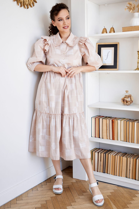 Стильное воздушное платье для ярких весенне-летних будней. Модные объемные рукава, большое количество оборок придают романтичное звучание модели. По переду платья нагрудные вытачки. Застежка на 5 пуговиц от подреза доверху. Воротник стояче-отложной с оборкой по краю. Рукав втачной, одношовный, на притачной манжете, с застежкой на одну пуговицу. Платье декорировано оборками в виде крылышек. Карманы в боковых швах.