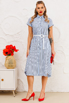 Морской стиль в одежде всегда выглядит элегантно и аккуратно. В летнем сезоне морская тема с многообразием полоски снова популярна. Она будет актуальна в городе и на отдыхе. Платье А-силуэта выполнено из ткани в полоску, на полочках обработаны вытачки, выходящие из бокового шва. Воротник рубашечного типа. Рукав втачной одношовный. Застежка на петли пуговицы. В боковых швах обработаны разрезы. Платье дополнено поясом, что позволяет регулировать ширину по линии талии.