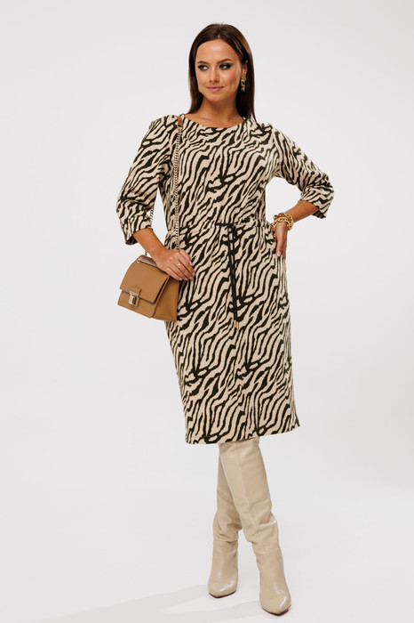 Платье женское полуприлегающего силуэта, выполненное из мягкого трикотажного полотна (тянется) с принтом «Зебра». Платье отрезное по линии талии с настрочной кулисой и отделочным шнуром. Спинка со средним швом и разрезом в нижней части. Рукава втачные, одношовные с притачной манжетой. Горловина по переду – фигурное «Каре», по спинке – округлая. Отделочный шнур декорирован металлическими наконечниками. Платье без подкладки.