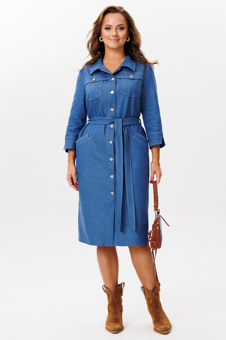 Стильное женское платье полуприлегающего силуэта, выполнено из эластичной джинсовой ткани. По переду кокетки с отлетным краем, рельефы, переходящие в линию кармана с листочкой, накладные карманы. Застежка центральная с отрезной планкой на петли и пробивные болты. Спинка со средним швом и талиевыми вытачками. Рукава втачные, одношовные с отрезными манжетами и разрезом по середине. Воротник отложной рубашечного типа. По боковым швам платья и среднему шву спинки настрочные шлевки для пояса, который выполнен из основной ткани. Платье без подкладки.