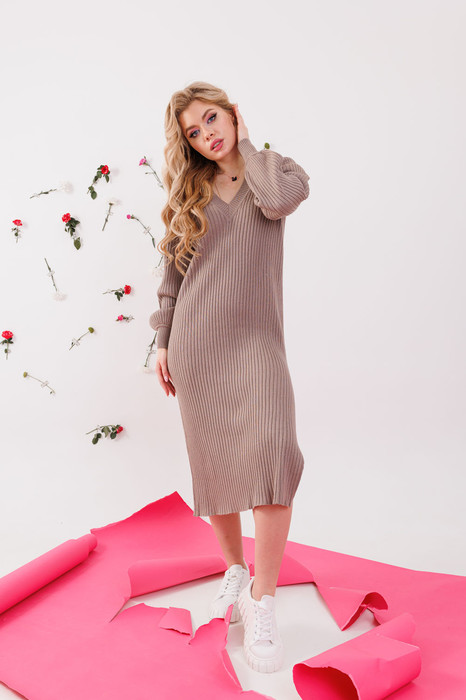 Стильное вязаное платье полуприлегающего силуэта выполнено из хлопковой итальянской пряжи. Изделие имеет V-образный вырез горловины, длинные свободными рукава с манжетой. Разрез в боковом шве и длина миди создают элегантный образ. Длина платья около 117 см.