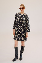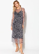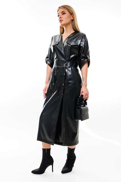 Эффектное двубортное платье длиной миди из экокожи на хлопковой основе полуприлегающего силуэта. Линия плеча приспущена, рукав втачной три четверти с манжетой и патой. Горловина обработана обтачкой с V-образным вырезом. Линия талии акцентирована притачным поясом. Имеются карманы в боковых швах. Изделие застёгивается на кнопки. Без подкладки.