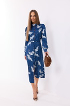 Комбинированное платье А-образного силуэта, отрезное по линии талии. Лиф изделия выполнен из трикотажной ткани, рукава и юбка - плательной вискозы.  По переду и спинке вертикальные рельефы.  Рукав втачной, низ рукава оформлен резинкой. Воротник - стойка. Застежка на тесьму -молнию, расположенную по центру переда и на воротнике. Изделие без подкладки.