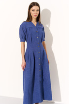 Элегантное платье приталенного силуэта, слегка расширенное к низу. Отрезное по линии талии. На деталях переда и спинки отрезные кокетки. На детали переда средний шов. По верхнему краю и на участке талиевого шва деталей переда и спинки выполнена сборка. Вырез горловины V-образной формы. На детали нижней части переда и спинки талиевые вытачки. Рукав длинный, втачной. Застежка платья на потайную молнию в боковом шве.