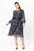 Воздушное платье, состоящее из лифа и юбки, имитирующее костюм-двойку. Лиф прямого кроя с втачным рукавом три четверти. Горловина обработана рубашечным воротником с отрезной стойкой. Застёжка центральная на пуговицы. По талии собрано на резинку. Юбка А-силуэта.