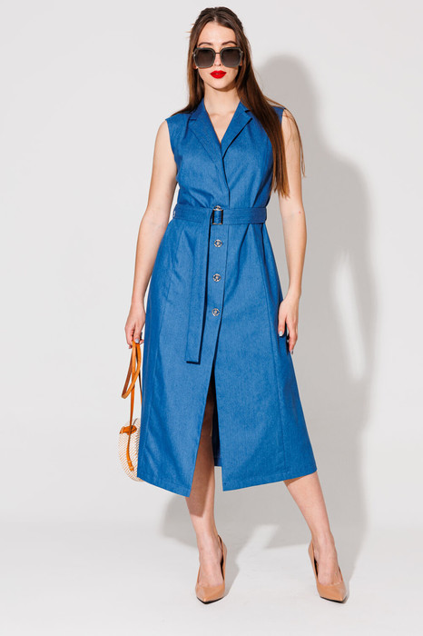 Платье-жилет  макси полуприлегающей силуэтной формы без рукавов. Полочка со смещённым бортовым краем назапах, с рельефными швами от линии плеча до низа. Застежка на петли и пуговицы. Спинка со средним швом и талиевыми вытачками. Воротник отложной с отрезной стойкой. В комплект входит пояс из основной ткани с отделочной пряжкой. Идеально комплектуется с брюками в качестве удлиненного жилета.
