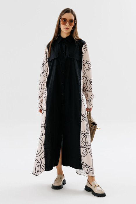 Классическое платье-рубашка прямого кроя в пол. Воротник отложной на стойке. Линия плеча немного приспущена. По груди расположены клапаны. Застёжка центральная на петли и пуговицы. Объёмный рукав с манжетой. Фигурные боковые вставки и рукава из отделочной ткани. Пояс из основной ткани входит в комплект.