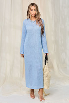 Платье макси комбинированное, двухцветное. Лиф выполнен из трикотажной ткани, от низа переда заложена складка, проходящая через плечевой шов до низа спинки. По линии талии с двух сторон настрочены кулисы с двух сторон со шнурком. Вырез горловины полукруглый. Рукава втачные, собраны на резинку. Юбка на резинке, драпирующаяся, расширенного силуэта.