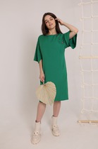 Платье состоит из двух платьев: нижнего и верхнего. Верхнее платье макси прямого свободного силуэта с воланом по низу изделия. Рукав втачной. Горловина обработана плосколежащим воротником. Центральная застёжка на петли и пуговицы. Нижнее платье комбинация на регулируемых бретелях.