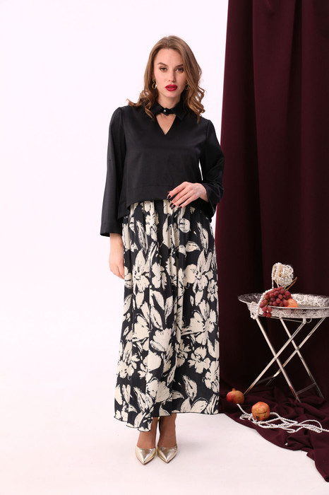 Платье комбинированное, состоящее из двух тканей. Лиф свободного прямого кроя прямого силуэта с V-образным вырезом. Воротник стояче-отложной рубашечного типа, застёгивается на декоративную пуговицу и петлю. Нижняя часть платья прямого силуэта, длинная , со сборкой по линии талии из отделочной ткани.