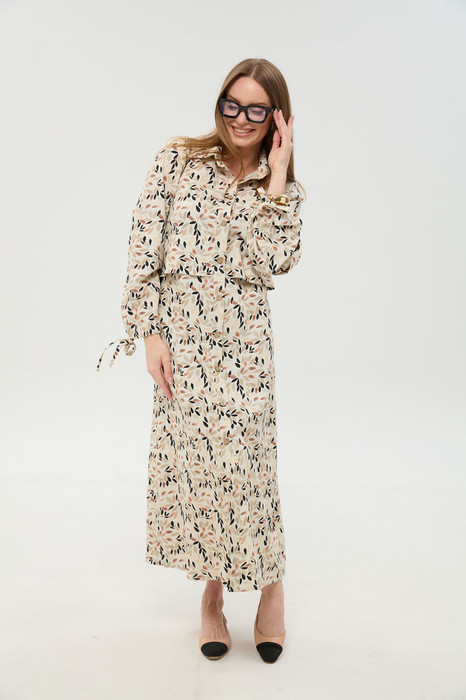 Платье макси с центральной отрезной застёжкой на потайную планку на петли и пуговицы.По переду и спинке цельнокроеные складки на уровне талии. Рукав втачной,одношовный рубашечноно типа. По низу рукава пробиты петли и вставлена завязка для фиксации сборки . Воротник рубашечный стояче отложной. В комплект к изделию идёт пояс из основной ткани для максимально комфортного регулирования объёма.