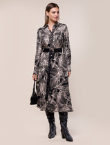 Платье женское прилегающего силуэта, выполнено из трикотажного полотна «велюр». Модель асимметричная, без подкладки, с плечевыми накладками. Перед платья состоит из двух частей перекрученных между собой по линии талии и скрепленных за запах. Перекрут деталей переда образует драпировку. На спинке расположены талиевые вытачки, в среднем шве – застежка на тесьму-«молнию» (50 см). Горловина округлой формы, углубленная спереди. Рукав длинный, втачной. Длина платья – 132 см, длина рукава – 57 см.