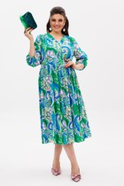 Платье женское прилегающего силуэта, выполнено из трикотажного полотна «велюр». Модель асимметричная, без подкладки, с плечевыми накладками. Перед платья состоит из двух частей перекрученных между собой по линии талии и скрепленных за запах. Перекрут деталей переда образует драпировку. На спинке расположены талиевые вытачки, в среднем шве – застежка на тесьму-«молнию» (50 см). Горловина округлой формы, углубленная спереди. Рукав длинный, втачной. Длина платья – 132 см, длина рукава – 57 см.