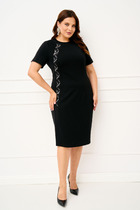Платье женское приталенного силуэта, выполнено из вискозного полотна. Модель без подкладки, без плечевых накладок. По линии талии спинки и переда -- отрезной пояс с широкой эластичной лентой внутри; по середине пояса прострочена отделочная строчка. Перед с внешней застежкой на 8 петель и 8 пуговиц; по линии талии – дополнительная внутренняя застежка на 1 пуговицу. В верхней и нижней части переда настрочены фигурные накладные карманы с бантовой складкой посередине и клапаны, застегивающиеся на 1 петлю и 1 пуговицу. Горловина оформлена отложным воротником на отрезной стойке. Рукав короткий, реглан; дополнен патой, зафиксированной на плечевом шве двумя шлевками и пуговицей. Длина платья – 110 см; длина рукава (от горловины) – 32 см.