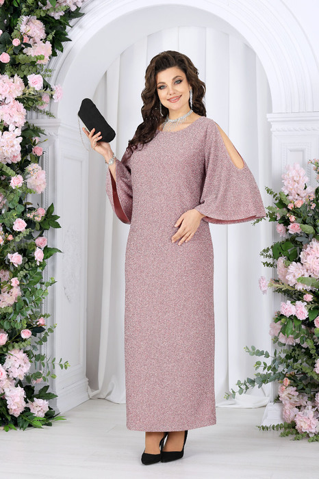 Платье женское полуприлегающего силуэта, выполнено из трикотажного полотна с фактурной лицевой стороной «люрекс». Модель на трикотажной подкладке, без застежки и плечевых накладок. Перед платья с нагрудными вытачками, направленными от проймы. Спинка с талиевыми вытачками и разрезом в нижней части среднего шва. Края V-образной горловины спинки фиксируются тремя перемычками из основного материала; горловина переда круглой формы. Рукав трехчетвертной, расширенный, с вырезом «капля» от плеча. Длина платья -- 144 см; длина рукава - 49 см.