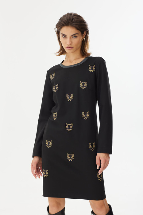 Платье прямого покроя. Модель сочетает в себе женственность и удобство. Перед декорирован дизайнерской вышивкой. Горловина переда декорирована экокожей. По спинке платья складка, декорированная молнией.
