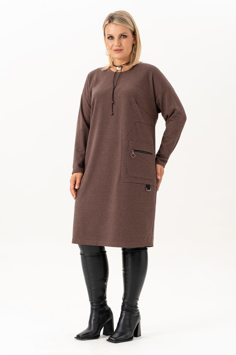 Женское платье прямого силуэта, из трикотажного полотна. На полочке обработан накладной карман с молнией и. Рукав длинный со спущенной линией плеча. Спинка со средним швом и талевыми выточками. Фасон интересен тем, что модельные линии как нельзя лучше подчеркивают плавные изгибы женской фигуры. В данной модели платья Вам не скрыться от неравнодушных взглядов противоположного пола. Оно станет отличным выбором осенью и зимой для офиса, для праздника, на каждый день, а также для прогулок. Платье подойдет как для высоких, так и для невысоких девушек и женщин. Такой стильный наряд для полных станет любимой вещью в гардеробе и сделает Ваш образ незабываемым!