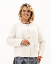 Невероятно нарядный классический женский жакет . Это стильный и комфортный жакет для женщин больших размеров, которые ценят комфорт и стиль. Жакет пошит из костюмной жаккардовой ткани , в состав которой входит вискоза и нейлон, это обеспечивает человеку свободу движения. Жакет короткий, полуприлегающего силуэта на подкладке. Спинка со средним швом. По переду жакета есть рельефные швы от плеча. Застёжка на петли и пуговицы. Рукав втачной , длинный, двухшовный. Горловина круглая, смотрится очень актуально и эффектно в сочетании с накладными карманами, которые украшены крупным жемчугом. Отличный вариант для вечернего гардероба, а также и просто для повседневного применения. Грация, изящество, утончённые декоративные элементы делают этот жакет уникальным.