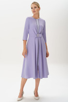 Элегантное платье выполнено из трикотажного полотна с люрексом. Платье отрезное по линии талии, собрано на резину по шву притачивания. Верх платья с удлиненной линией плеча и свободной заниженной проймой. Длина рукава от горловины в 46 р-ре – 21 см. в 60 р-ре – 27 см. Перед платья с глубоким запахом, образующим V-образный вырез. Спинка со средним швом. Горловина спинки обработана обтачкой. Юбка платья по переду с глубоким запахом. Спинка целая. Низ платья фигурный, ассиметричный. Платье без застежек и подклада. Длина изделия по спинке в 46 р-ре – 121 см. в 60 р-ре – 129 см.