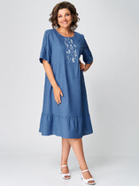 Удобное повседневное платье А-силуэта, выполнено из эластичного микровельвета. Платье по переду с втачной планкой с застежкой на петли и пуговицы, двумя нагрудными вытачками и фигурными накладными карманами. В верхнем углу правого кармана эмблема из кожи. Спинка целая. Горловина переда и спинки с втачными отложным воротником на стойке. Рукав втачной длинный из двух частей с широким притачным манжетом по низу с застежкой на петли и пуговицы. Нижняя часть рукава со встречной складкой, что придает дополнительный объем рукаву. Длина рукава от плеча в 46 р-ре – 59 см. в 62 р-ре – 64 см., ширина рукава по низу в 46 р-ре – 19 см. в 62 р-ре – 25 см. Платье без подклада. Длина изделия по спинке в 46 р-ре – 93 см. в 62 р-ре – 104 см.