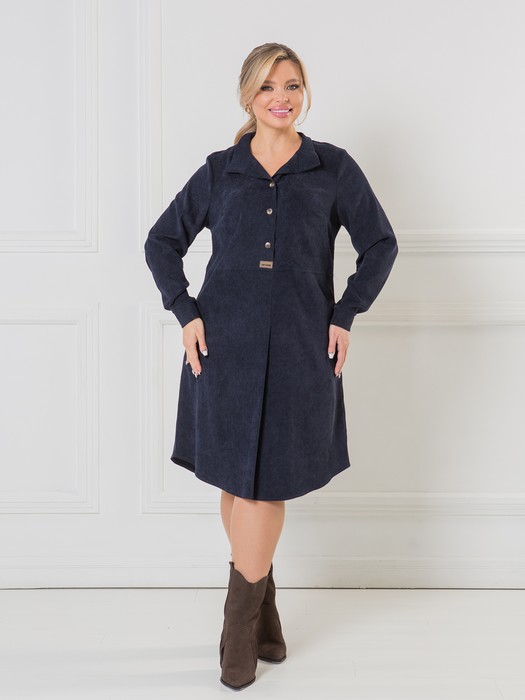 Удобное повседневное платье А-силуэта, выполнено из эластичного микровельвета. Платье по переду отрезное по линии талии. Верх переда с двумя нагрудными вытачками и центральной застежкой на петли и пуговицы. Нижняя часть платья со складкой посередине, имитирующей шлицу. Шов притачивания линии талии с отделочной строчкой и настрочной эмблемой по низу застежки. Спинка со средним швом. Горловина переда и спинки с втачным воротником по типу апаш. Рукав втачной длинный с притачными манжетами по низу. Длина рукава от плеча в 50 р-ре –В В 58 см. в 64 р-ре – 64 см., ширина рукава по низу в 50 р-ре – 20 см. в 64 р-ре – 24 см. Манжеты с застежкой на петли и пуговицы. Платье без подклада. Длина изделия по спинке в 50 р-ре – 100 см. в 64 р-ре – 109 см.