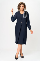 Элегантное платье прямого силуэта, выполнено из эластичной плательной ткани Ниагара. По переду застрочена глубокая фигурная складка, образующая оригинальный волан. Фигуру можно подчеркнуть мягкими полупоясами с завязывающимися концами, расположенными в боковом шве и шве застрачивания складки переда. Спинка с двумя с вертикальными вытачками, средним швом и шлицей длиной 28 см. Круглый вырез горловины переда и спинки обработан обтачкой. Рукав втачной, прямой. Длина рукава от плечевой точки в 46 р-ре – 40 см., в 56 р-ре – 42 см., обхват рукава по низу в 46 р-ре – 26 см., в 56 р-ре – 32 см. Платье без подкалада и застежек. Длина по спинке в 46 р-ре – 102 см. в 56 р-ре – 104 см.