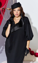 Платье полуприлегающего силуэта, со спущенным плечом, выполнено из трикотажного полотна, отрезное по талии. Верхняя часть переда и спинки более свободной формы. На переде расположена потайная планка на петли-пуговицы до подрезной линии. На левой детали переда в области груди расположена прорезная листочка – обманка. Воротник стояче-отложной с отрезной стойкой. В верхней части переда и спинки заложены односторонние складки, направленные к боковому шву. В нижней части переда расположен переходящий в разрез средний шов. На талии, по переду и спинке расположены вытачки. К платью прилагается пояс из основной ткани. Отделкой в данной модели служит фурнитура контрастного цвета.