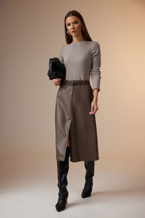 Платье женское полуприлегающего силуэта, выполнено из двух видов ткани: верх из трикотажного полотна в джемпере, низ виде расширенной юбки из кожзаменителя. Джемпер с круглой горловиной, с втачными длинными рукавами и молнией по центру спинки. Юбка со средним швом на передней половинке, в котором шлица снизу и наклонные карманы. На заднем полотнище средний шов, в котором заканчивается молния и талиевые вытачки. На переднем и заднем полотнище пришиты шлевки.