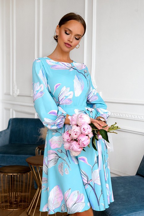 Платье с очень нежным цветным принтом на голубом фоне. Отрезное по линии талии с пояском. Рукав собран в резинку. Расклешенная юбка придаст чувство легкости и комфорта.