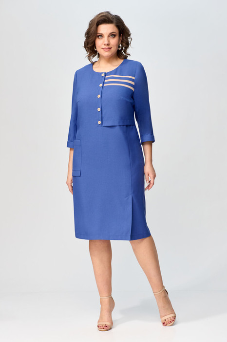 По переду платье ассиметричное: в левой части переда расположена отлетная кокетка до уровня талии с деталями в области плеча из отделочной ткани, в правой части в области бедер расположен накладной карман. Дополнением платья служат пуговицы в цвет отделки.