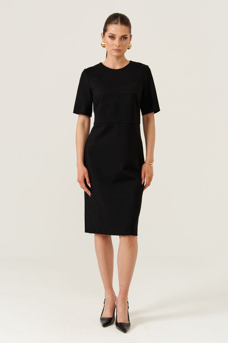 Женское платье из трикотажа с добавлением вискозы, предназначенное для повседневной носки. Модель выполнена в полуприлегающем силуэте и отрезаная по линии талии, что подчеркивает фигуру и создает элегантный образ. Лиф переда состоит из нескольких частей с имитацией корсета, придавая изделию стильный и структурированный вид. Лиф спинки выполнен с отрезной кокеткой и рельефами, обеспечивая хорошую посадку и аккуратность силуэта. Заднее полотнище юбки украшено двумя талиевыми вытачками для лучшей формы. В шве спинки расположена потайная застежка-молния и небольшой разрез в нижней части для удобства при движении. Горловина расширенная, что создает комфортный вырез. Рукава втачные длиной до локтя дополняют образ и обеспечивают комфорт. Длина платья — миди, цвет — черный, универсальный и легко сочетаемый с различными аксессуарами.