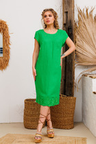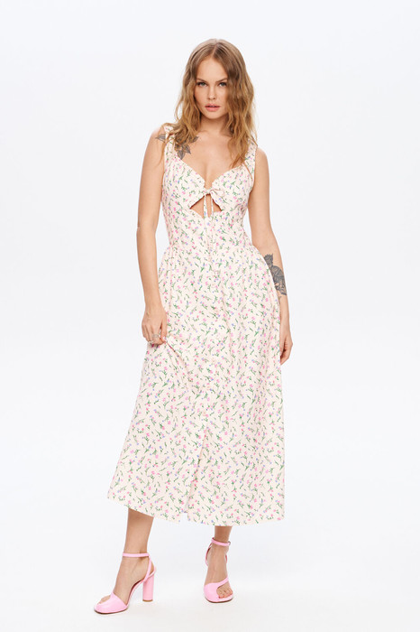 Детали: отрезная линия талии, фигурный лиф с регулируемыми завязками и оборками, застежка по переду на петли и пуговицы, юбка платья со сборкой по бокам, функциональные карманы, платье на подкладке. Подкладка юбки платья- 100% вискоза.