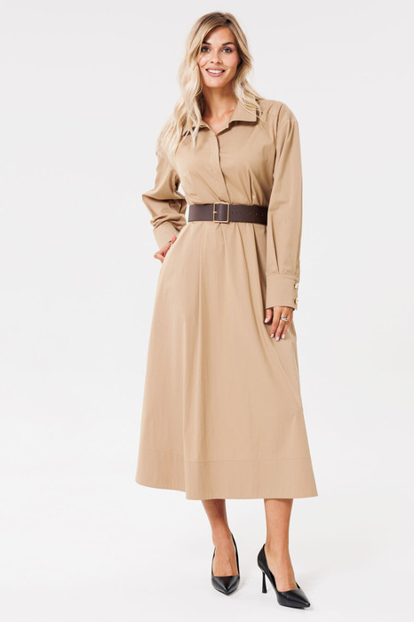 Платье женское из текстильной ткани, отрезное по линии талии, расширенное к низу. По юбке спереди и сзади заложены складки. В боковых швах расположены карманы. По центру лифа есть потайная застежка на петлях-пуговицах. Верхняя часть спинки с кокеткой. Рукав одношовный, низ рукава обработан манжетой на петлях-пуговицах. В платье спущенное плечо. Вырез горловины обработан воротником со стойкой. Платье свободное. Низ платья обработан широкой обтачкой с закрытым швом. Пояс в комплект не входит.
