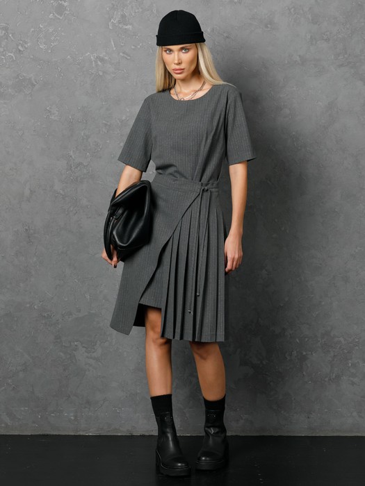 Модель А-образного силуэта, со спущенным плечом и коротким рукавом, без подклада, без застёжки. В боковых швах карманы. Съёмная юбка с запахом, на притачном поясе, с застёжкой на потайные пуговицы и завязки с наконечниками. Перед ассиметричный, со складками.