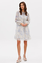 Модель полуприлегающего силуэта, с фантазийным рукавом длиной 3/4, без подклада. Перед и спинка со средним швом. V-образный вырез горловины. Талия подчёркнута съёмным завязывающимся поясом из основной ткани.