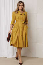 Модель полуприлегающего силуэта, с коротким цельнокроеным рукавом, на частичном подкладе из хлопка. Перед и спинка с кокетками, горизонтальным подрезом и рельефами. Спереди планка с застёжкой на петли и пуговицы. Воротник сорочечный. По низу рукава манжета с отворотом. Талия подчёркнута поясом шнурком.