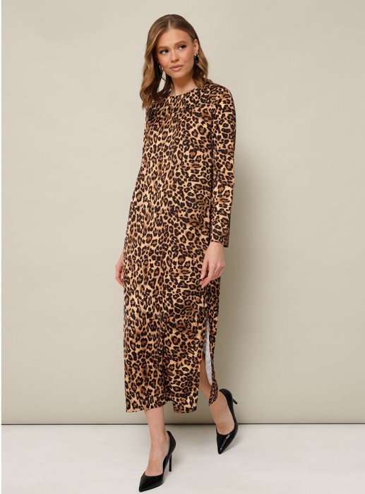 Платье прямого силуэта в длине миди, выполнено из струящейся ткани с благородным матовым блеском и актуальным анималистичным принтом. Округлый вырез горловины. Рукава длинные втачные. Застежка по спинке в среднем шве «капля» на пуговицу и навесную петлю. По низу в боковых швах обработаны высокие разрезы.